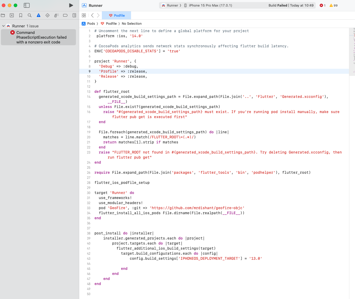 I have been trying to compile my flutter app on xcode 15.2 on MacBook Pro M1 Pro chip. I keep on getting this error: "Command PhaseScriptExecution failed with a nonzero exit code". I tried everything that I could find online and nothing works. IS this a problem with the new update or is there a seeting that need to do? Here is my podfile: