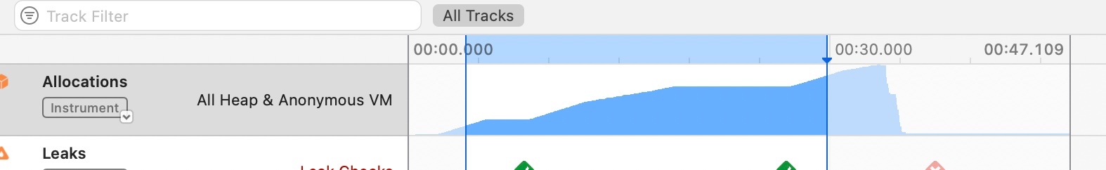 However, if I run it under Instruments' Leaks template... Activity Monitor says it's used only about 60mbytes. (And at the end of the run, Instruments says it's used about 30mbytes.)