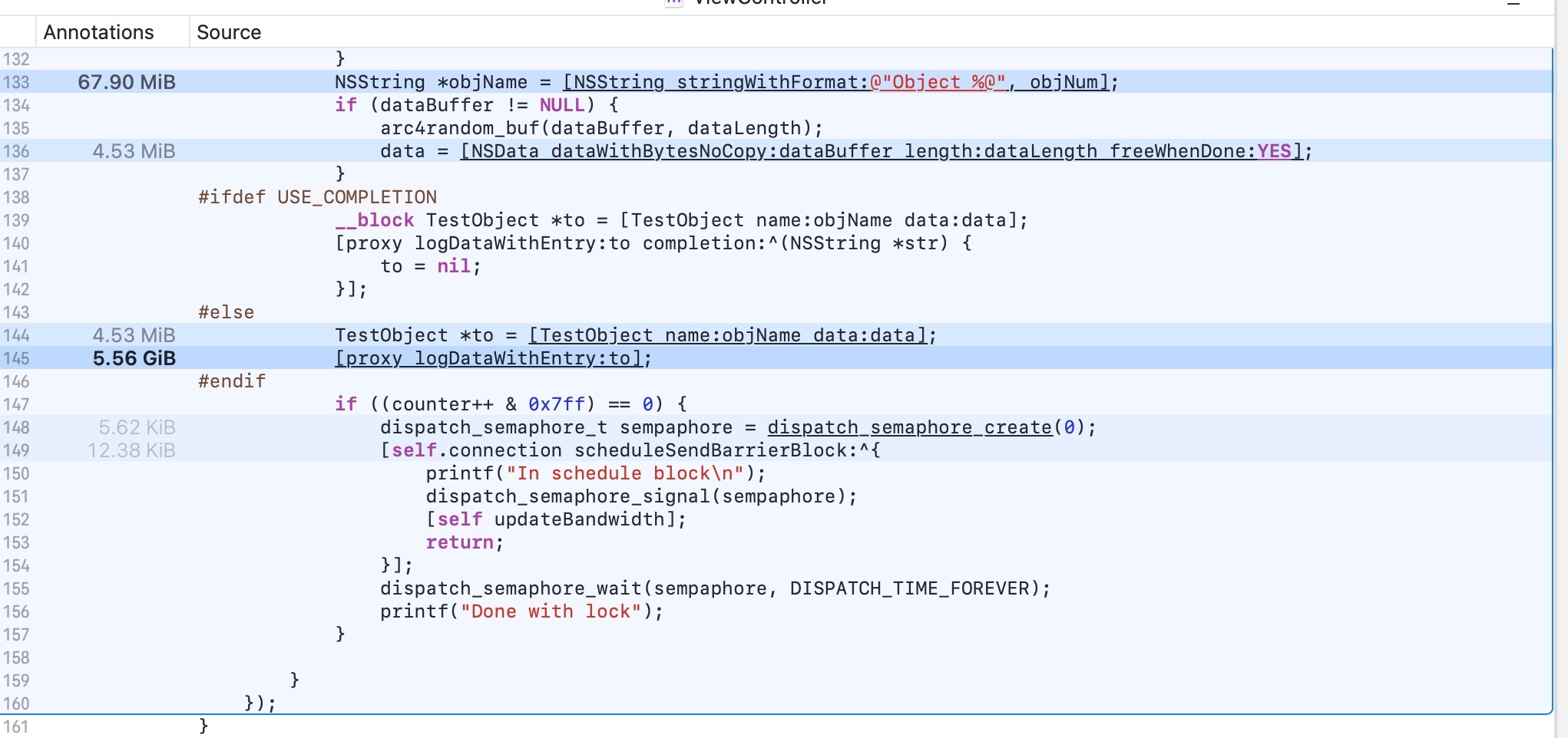 Now... if I use the completion and a synchronous proxy, then even without Instruments, Activity Monitor says it's 60mbytes or so.