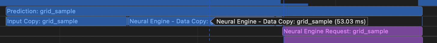 I am currently facing a performance issue while using CoreML on iOS 16+ devices to run a simple grid_sample model. When profiling the model using xcode Profiler, I noticed that before each NPU computation, there is a significant delay caused by the "input copy" and "neural engine-data copy" operations.I have specified that both the input and output of the model are of type float16, there shouldn't be any data type convert.