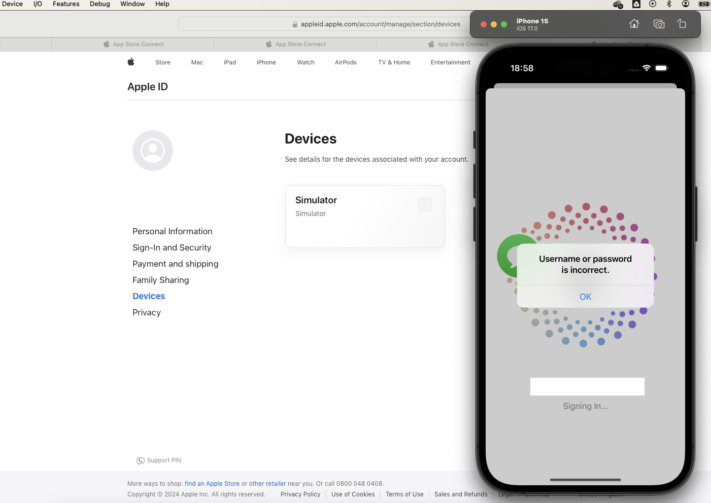 You can see in the simulator background. I can login to https://appleid.apple.com/#!&page=signin using the new apple id + password via web browser. But, I am not sure why I am not able login into the simulator itself.