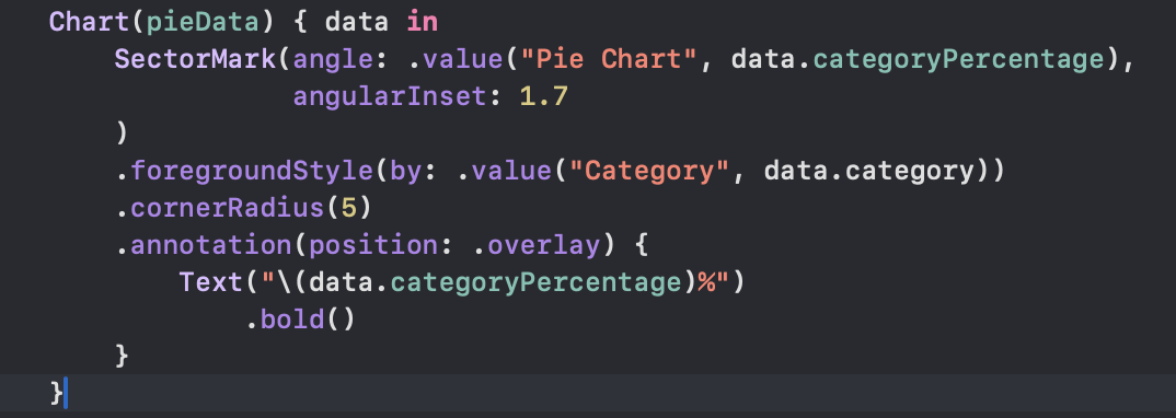SectorMark(angle: .value("Pie Chart", data.categoryPercentage),