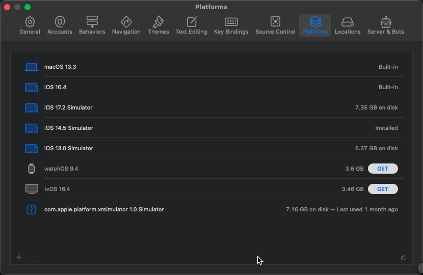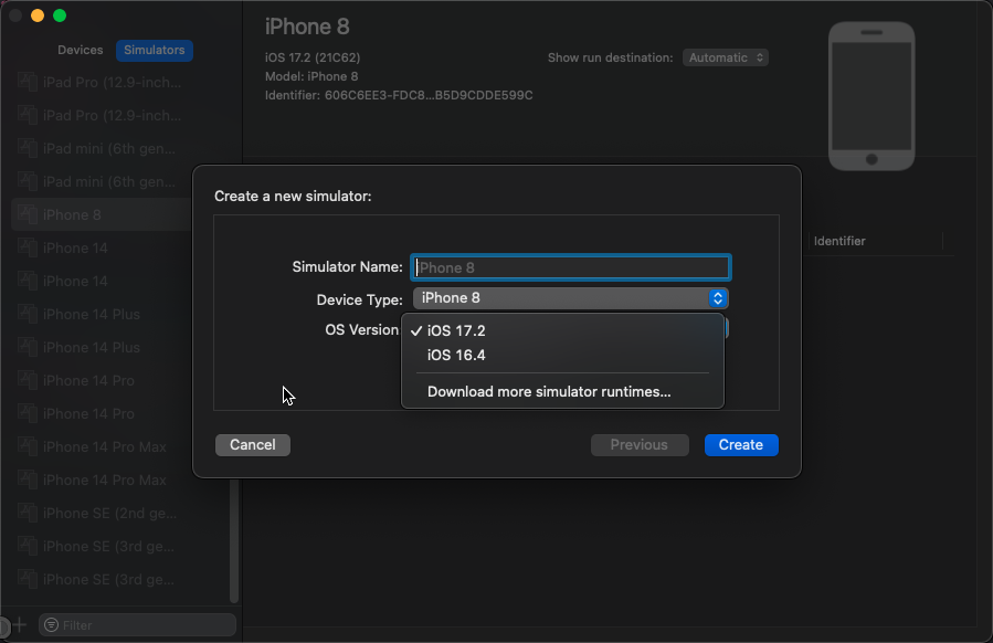 My Xcode version is 14.3(14E222b), MacOS is 13.6.4 with M1 Pro chip, according to Xcode support page, the Xcode supports iOS simulator from 13.7 to 16.4.