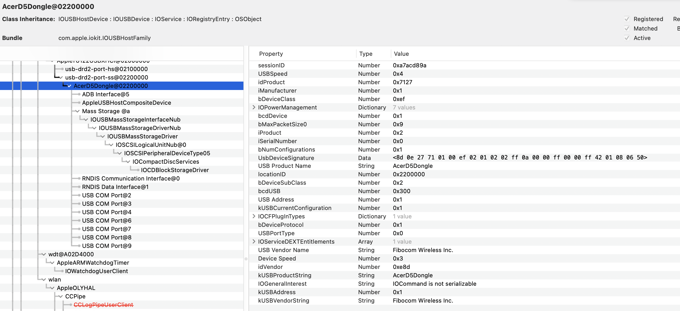 I have an Acer Connect D5 Dongle (A very small 5G USB-C Modem). When I plug in to Mac Mac (Sonoma 14.5b) The Dongle is perfectly show in system profiler and IORegistryExplorer like an old Sierra WWAN or Novatel Merlin.