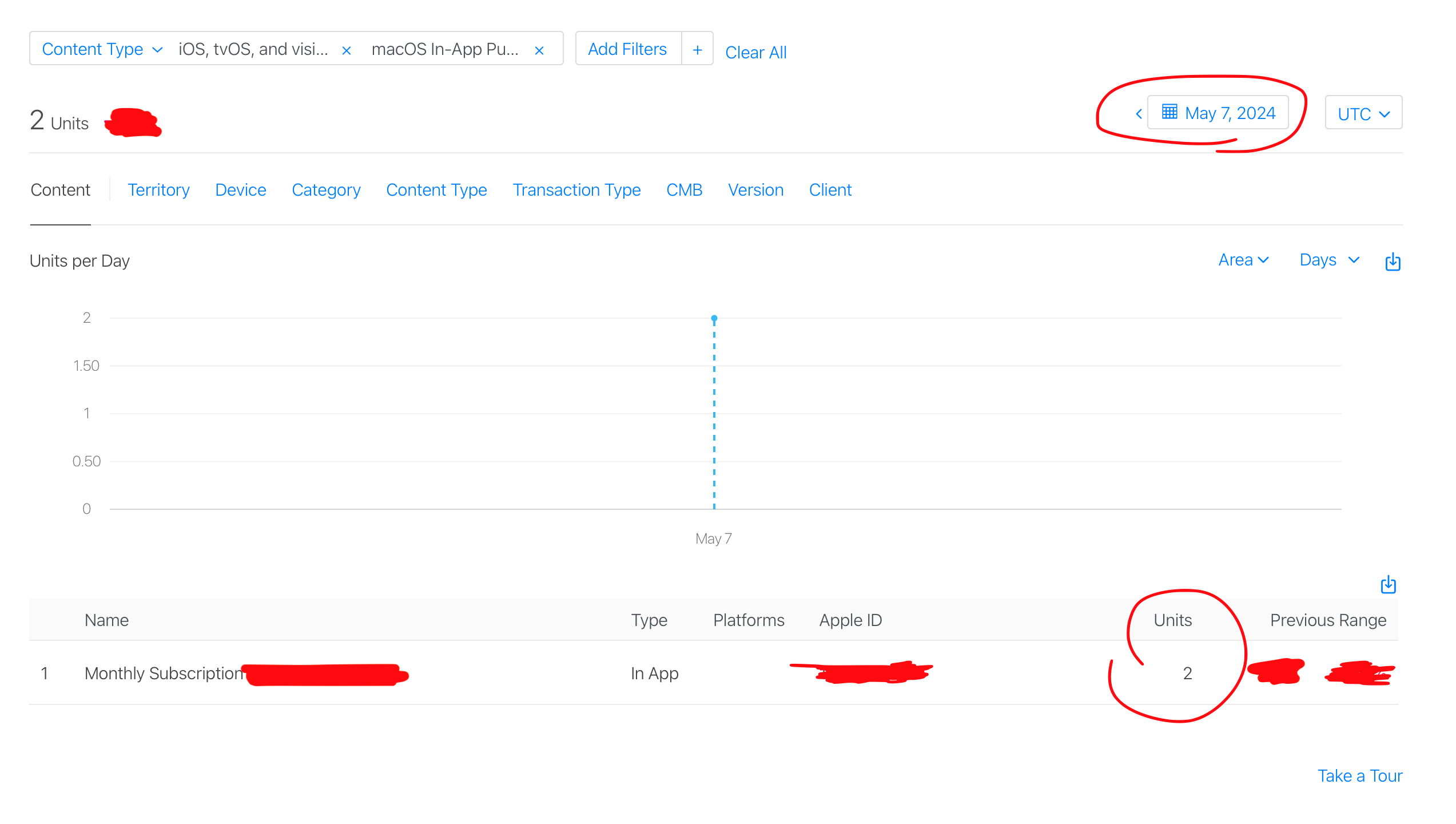 While our records indicate these transactions, the Apple iTunes dashboard only displays 3 monthly subscriptions for May 7th. May 6th and 5th is worse; almost 1 or 2 monthly subscriptions are showing.