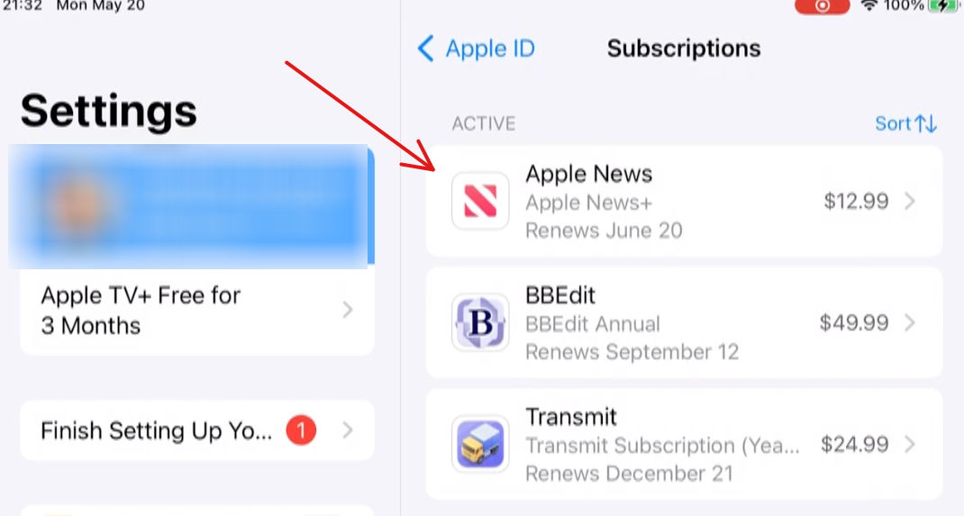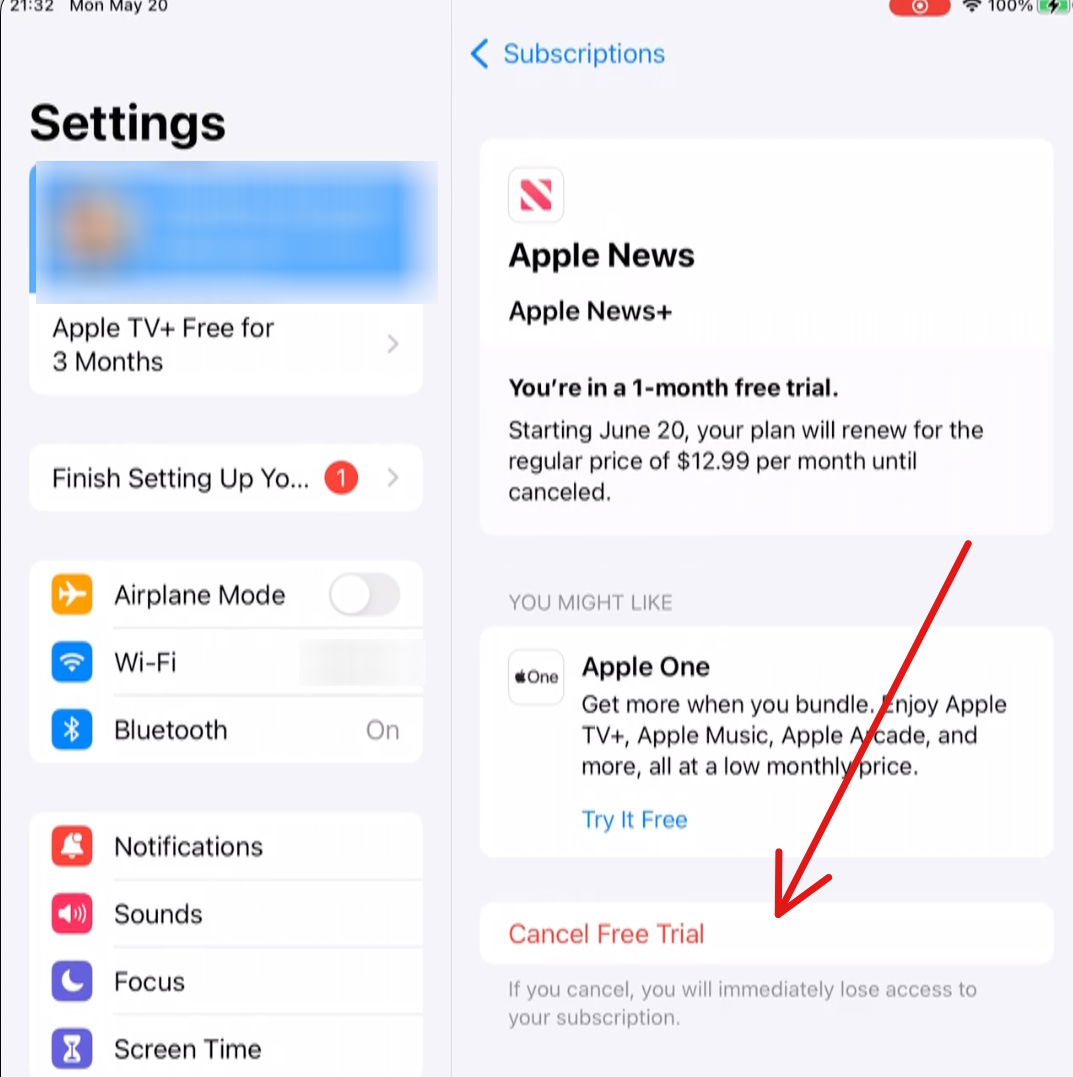For comparison, we subscribed to Apple News+, which has a free trial period. The app does show up in the subscriptions list, and has a Cancel Free Trial button: