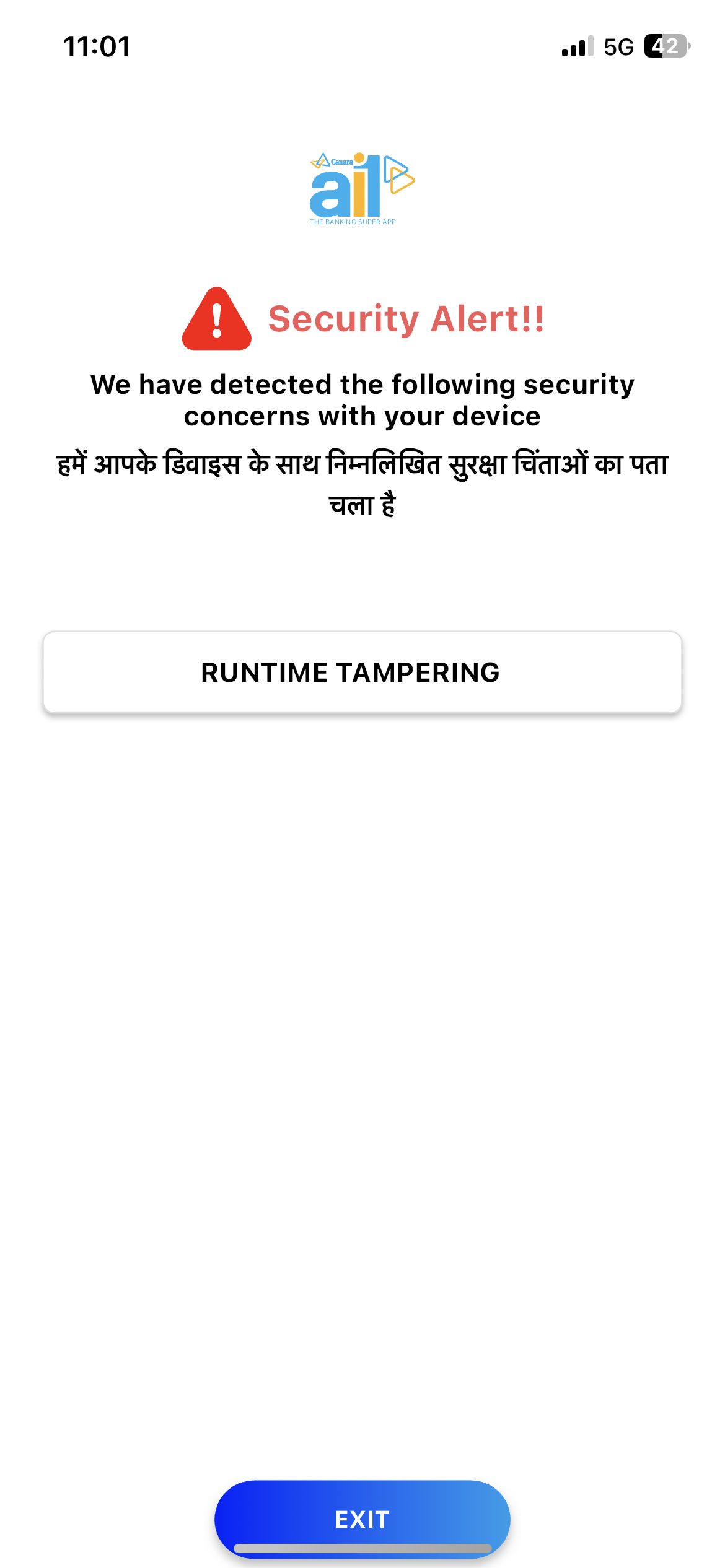 Runtime tampering error showing when using banking app