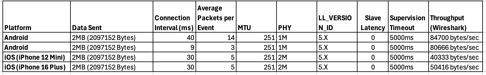 In contrast, all other iOS devices tested support multiple packets per connection interval and achieve much higher throughput.