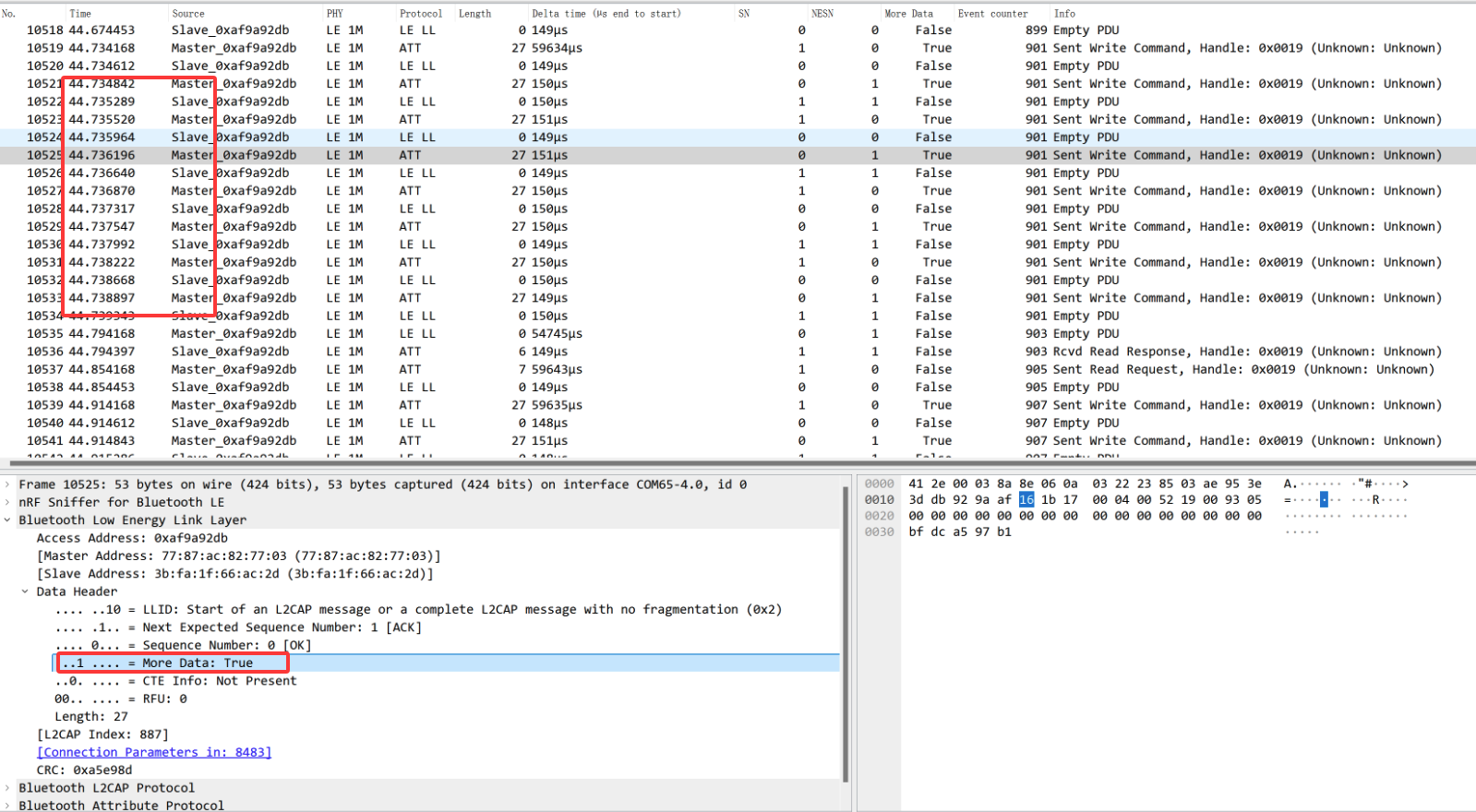 I encountered the same issue. On iPadOS 17 and earlier systems, data packets could be sent multiple times within a single connection interval, but on iPadOS, they could only be sent once. Using a packet capture tool, I discovered that within a connection interval, iPadOS sends a packet of data with the "More Data" attribute set to True, while iPadOS sends it with the attribute set to False. As shown in the figure, multiple transmissions can occur within a very short time interval. In iPadOS 18, only one transmission is allowed with an interval of 30ms Has your problem been solved? I would like to know if this issue is due to some restrictions imposed by iPadOS 18 or if there is a problem with our program configuration. I am looking forward to your reply