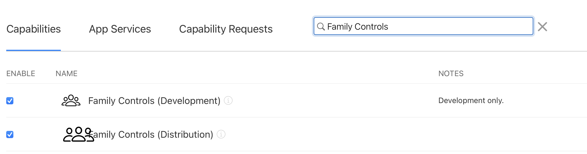 In Certificates, Identifiers & Profiles → Identifiers, I can clearly see that the capability Family Controls (Distribution) is enabled for both App IDs.