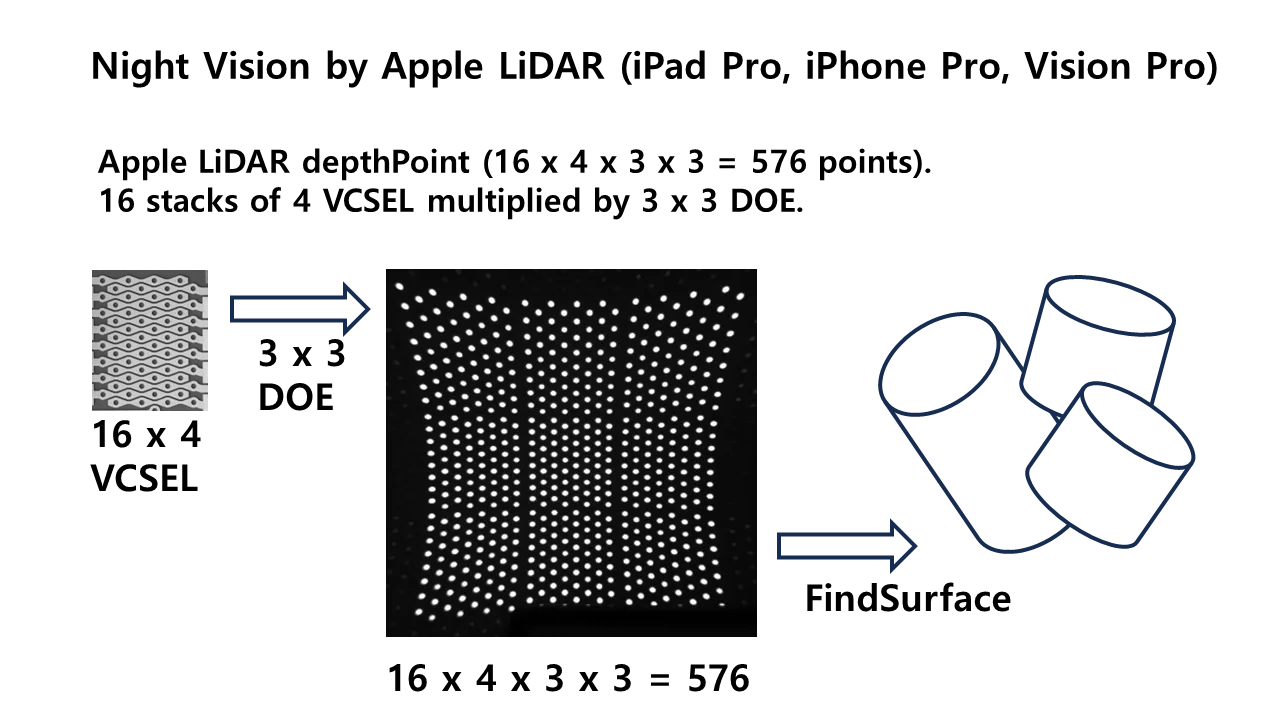 How 64 (with DOE to 576) or 111 (without DOE) VCSELs are arranged plays no role. The SPAD pixel coordinates and dToF timing (i.e. distance) is ultimate. Apple does not open the API.