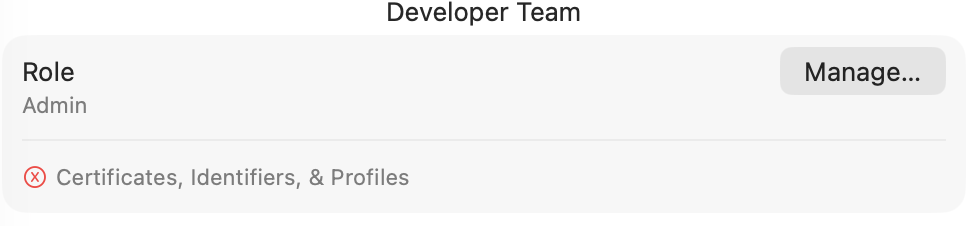 In Xcode → Settings → Accounts → Team, the “Certificates, Identifiers, & Profiles” section shows a red error indicator and doesn’t load.