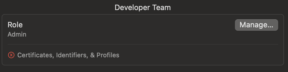 In Xcode → Settings → Accounts → Team, the “Certificates, Identifiers, & Profiles” section shows a red error indicator and doesn’t load.