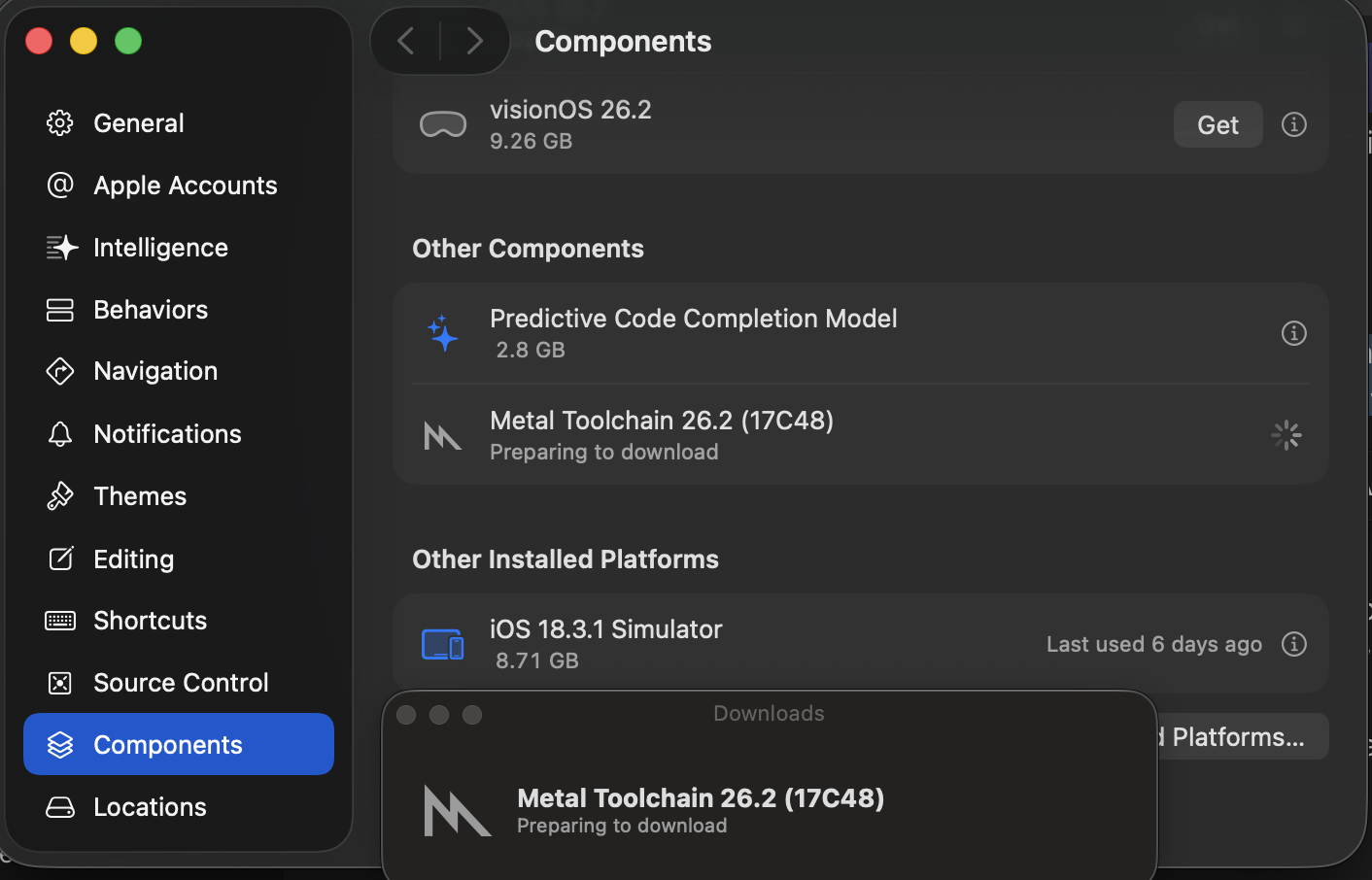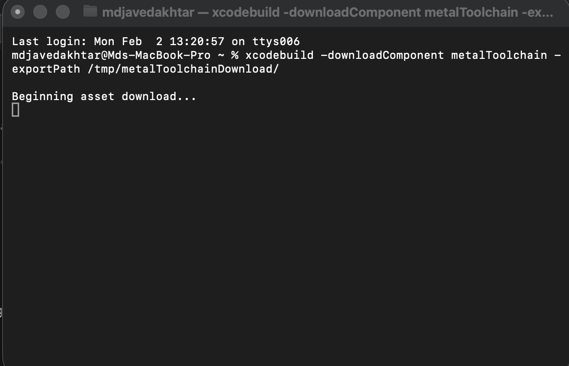 I’m attempting to install the Metal toolchain in Xcode, but the installation keeps hanging. Through Xcode, it stops at the “Processing” step, and via the terminal, it never goes past “Beginning asset download…”.