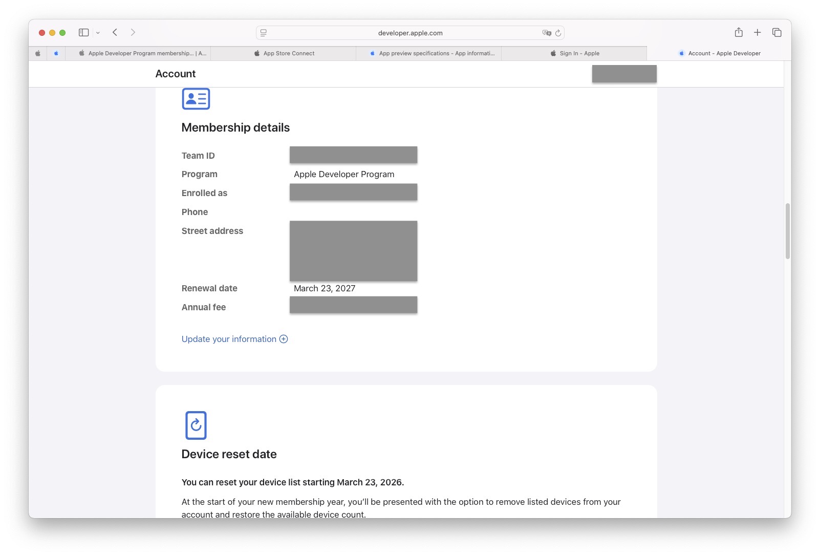 I just renewed my Apple Developer Program membership (annual subscription) and received my order confirmation (Order #W1411330632, placed February 28, 2026) for $1,749.00 MXN.