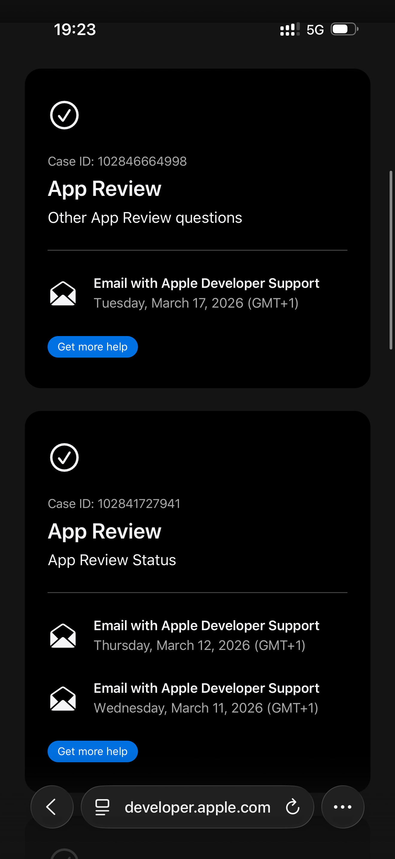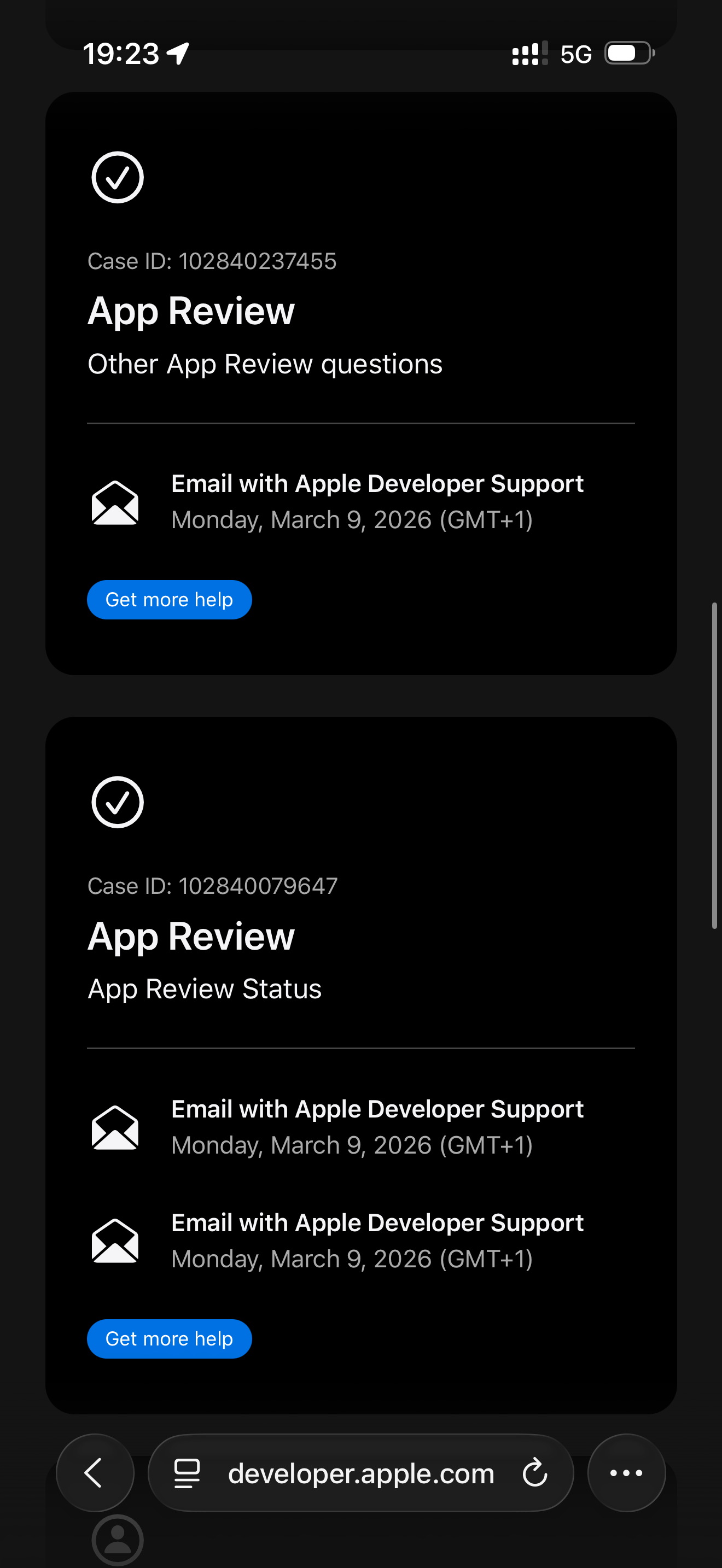 I have contacted Apple Developer Support multiple times (Case IDs: 102840237455, 102840079647, 102846664998, 102841727941) starting from March 9, but unfortunately, I have not received any response to any of these requests.