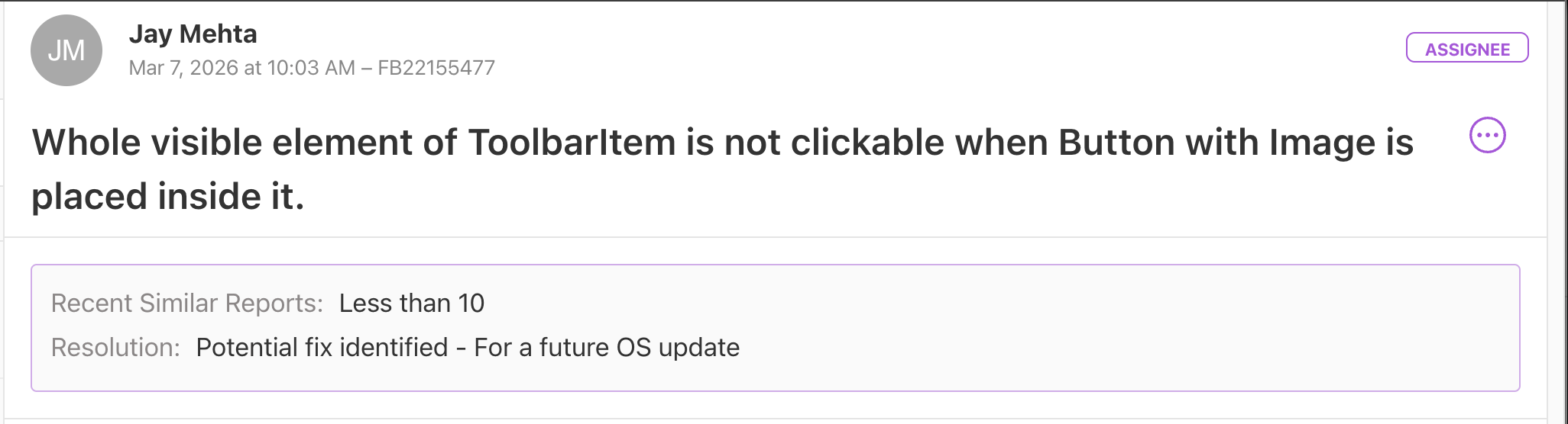Does anyone know if Apple is addressing the issue with buttons. They break the fundamental clarity stressed by Human guidelines by exposing an area around an element that is to be tapped. If that area is then defined as a part of the button it should by default then respond to the tap. But it doesn't. My app when you tap on those elements before Liquid Glass ALWAYS RESPONDS. With Liquid Glass, a glancing tap will get the requisite reaction but doesn't trigger the event it should.