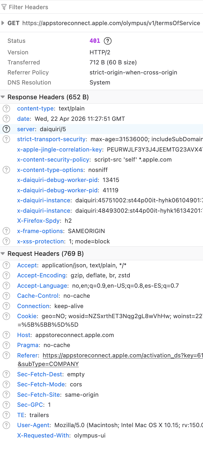 This page is just white with a spinning load icon. The browser network log shows that a GET call to https://appstoreconnect.apple.com/olympus/v1/termsOfService fails with a 401 error. See attached screenshot.