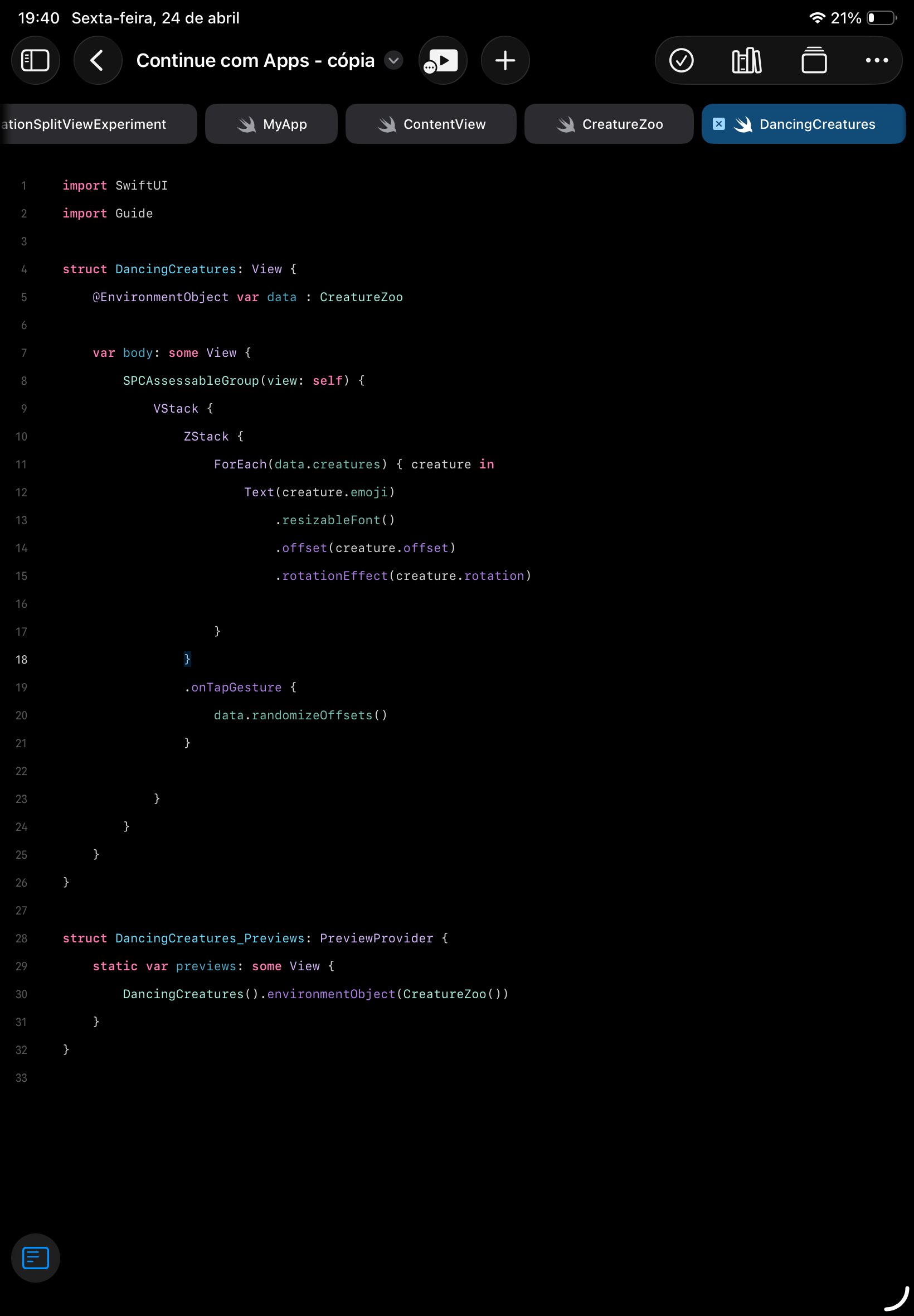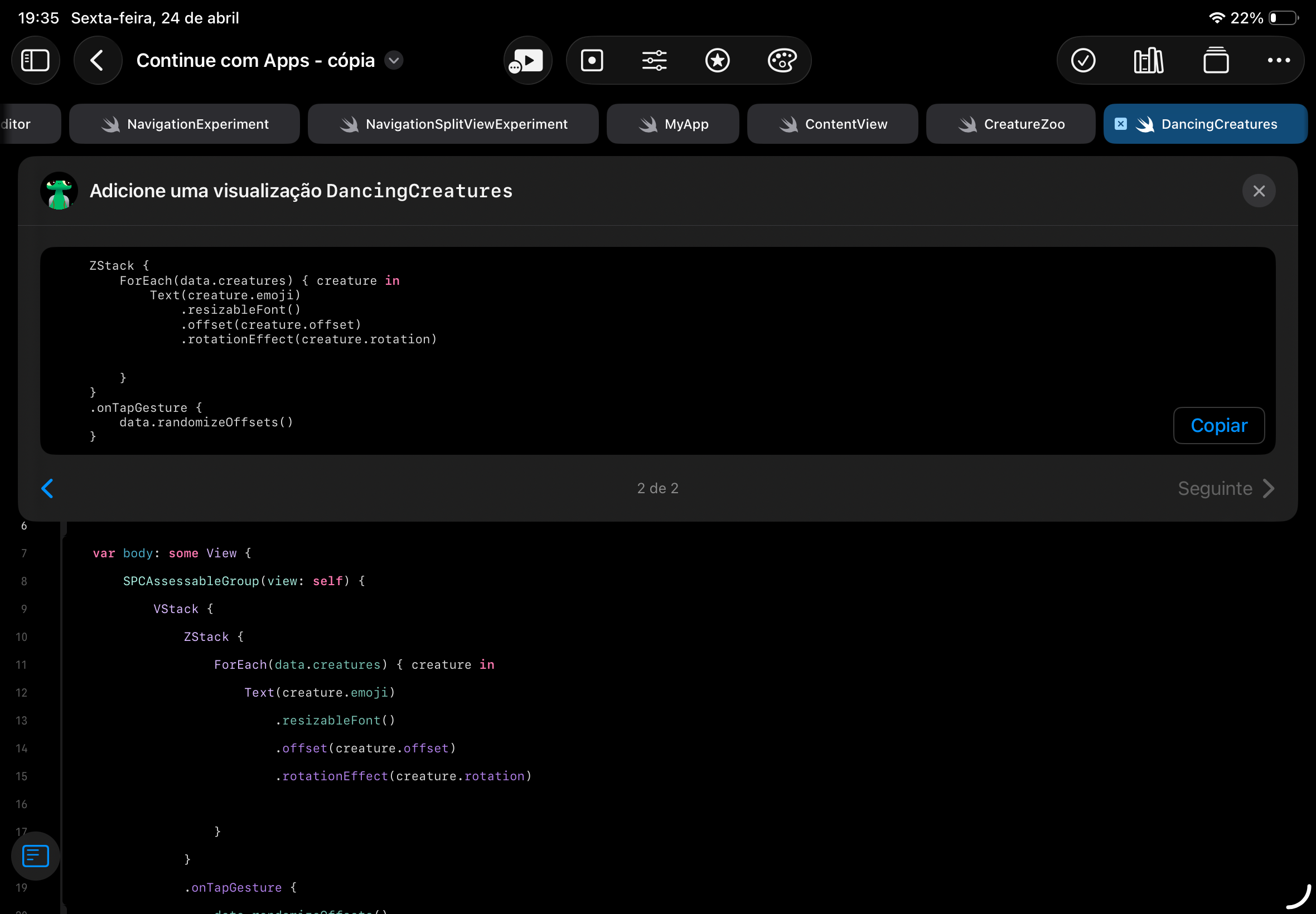 I'm almost having a heart attack with this "a DancingCreatures view" issue. I must be really dumb I've tried everything and the question just won't move forward. Someone, for the love of God, explain to me what it would be.